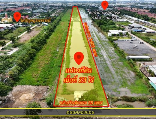 ที่ดิน 23 ไร่ คลอง 3 คลองหลวง ทำเลเด่น เหมาะลงทุนหรือพัฒนาโครงการ โทร 064-5939524